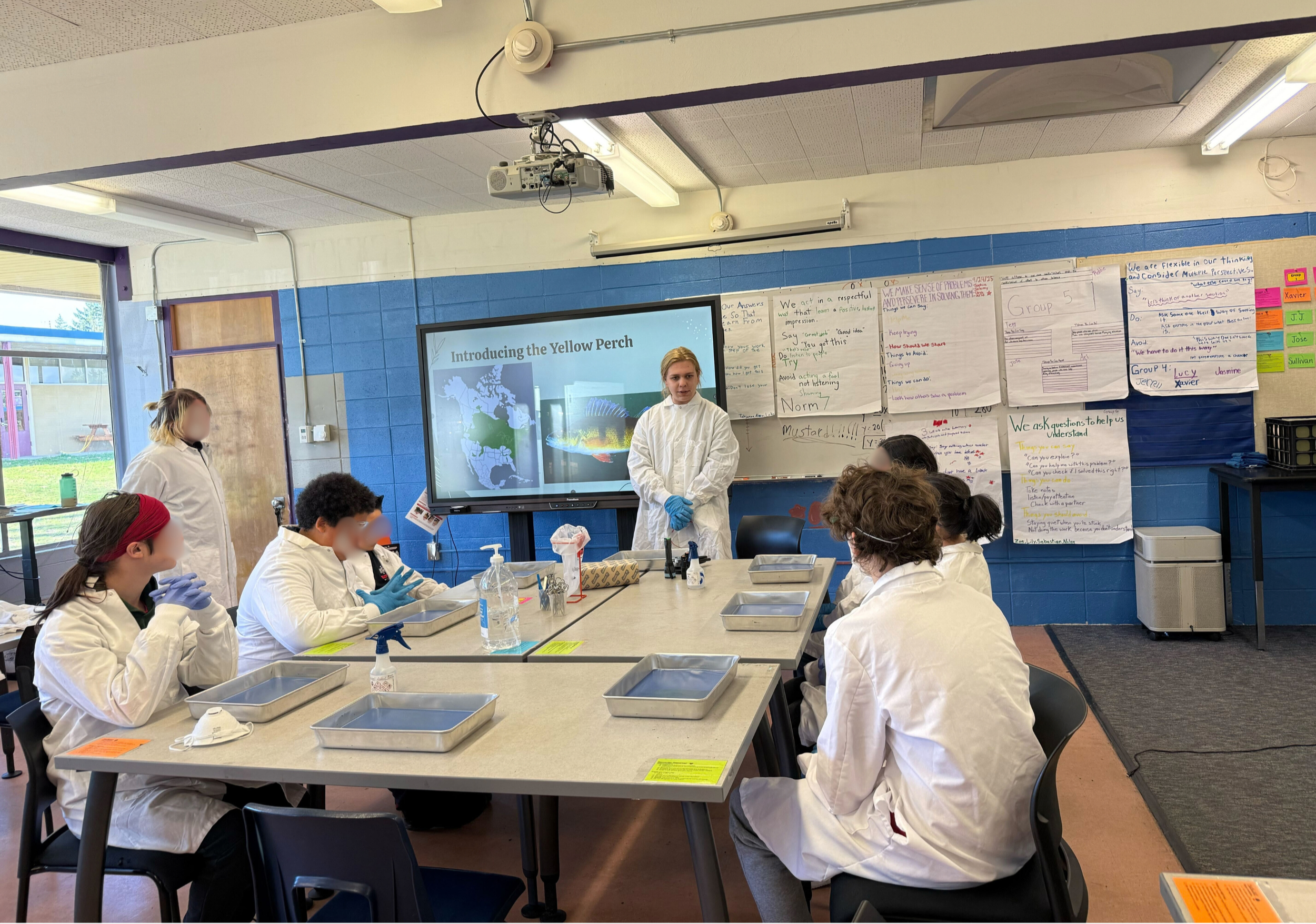 We held a series of hour-long independent learning sessions at the Big Picture School in Burien, covering topics such as lab safety fundamentals, marine science, and air pollution. Classes were comprised of middle & high school students. Here, Lucian is teaching a session on fish dissection.